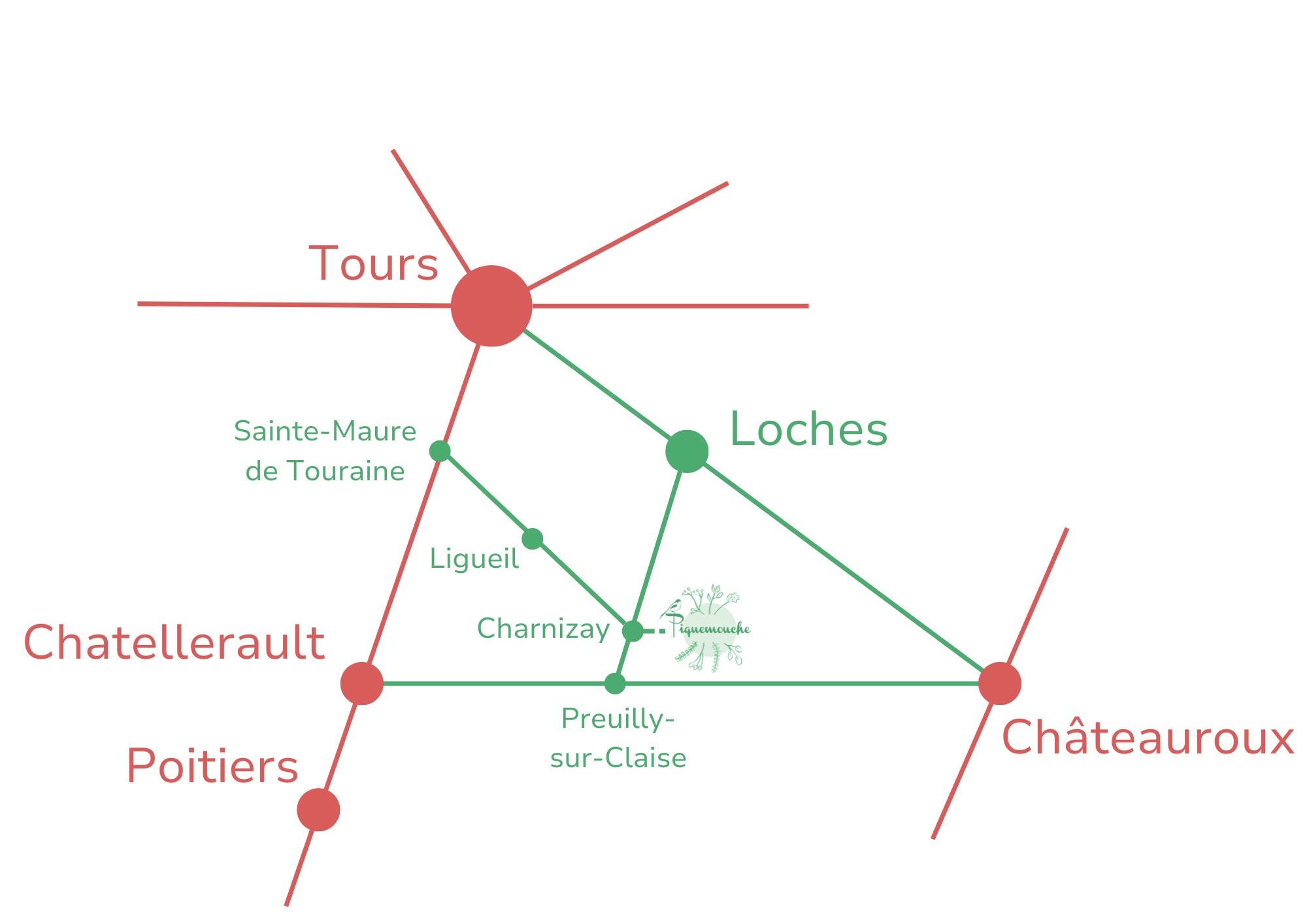 Le prix de la quiétude, c’est qu’un véhicule est nécessaire pour séjourner à Piquemouche. Nous sommes situés à l’Ouest de la Région Centre, à une bonne heure au Sud de Tours et au Nord-Est de Poitiers, entre les autoroutes et les gares de Chatellerault et de Chateauroux. Nous ne sommes malheureusement pas desservis par les transports en commun.